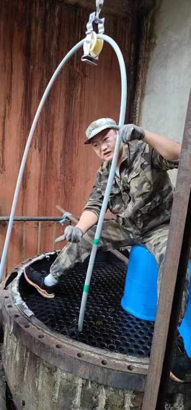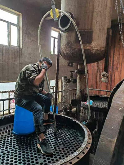 2022年5月28日黑龍江省哈爾濱市呼蘭區(qū)康金鎮(zhèn)小趙村哈爾濱市盛大化工有限公司在費總的精心安排下,孫總親自坐鎮(zhèn)指導,生產(chǎn)廠長潘峰與河南都市機械設備有限公司喬主任,都紅植技師密切配合,徹底了解GQ-600型智能清洗機的性能和特點,使用600型智能清洗機四個要點1,不能缺水,要使用干凈的靜水,2,過載保護扭力限制器要調(diào)到,軟軸跳動可以自動停下來,不然既不安全,又失去他的意義,3,軟軸要放平拉直,順勁擺放,不能打死彎,盡可能防止扭軸斷軸,4,鉆頭要大小適當,太大了容易卡軸扭軸斷軸,并且一定要直對疏通管道口。三天時間打通清洗了兩臺徹底堵死好、結垢堅硬的污水蒸發(fā)器,廢水蒸發(fā)器,沒有損壞一根軟軸,沒有損壞一個鉆頭和配件,為糠醛行業(yè)增加了自信,減少了資金損耗,降低成本,提益,做出了標桿!